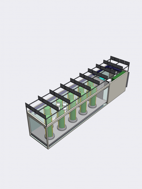Indoor vertical growing module (40”, 20” or tailor-made) with racks for 1020″ trays, continuous trays (more capacity) or standpipes depending on the type of crop. Choice of three fertigation systems and automated production recipes based on industrial PLC. Suitable for green leaf, mushroom, and microgreens